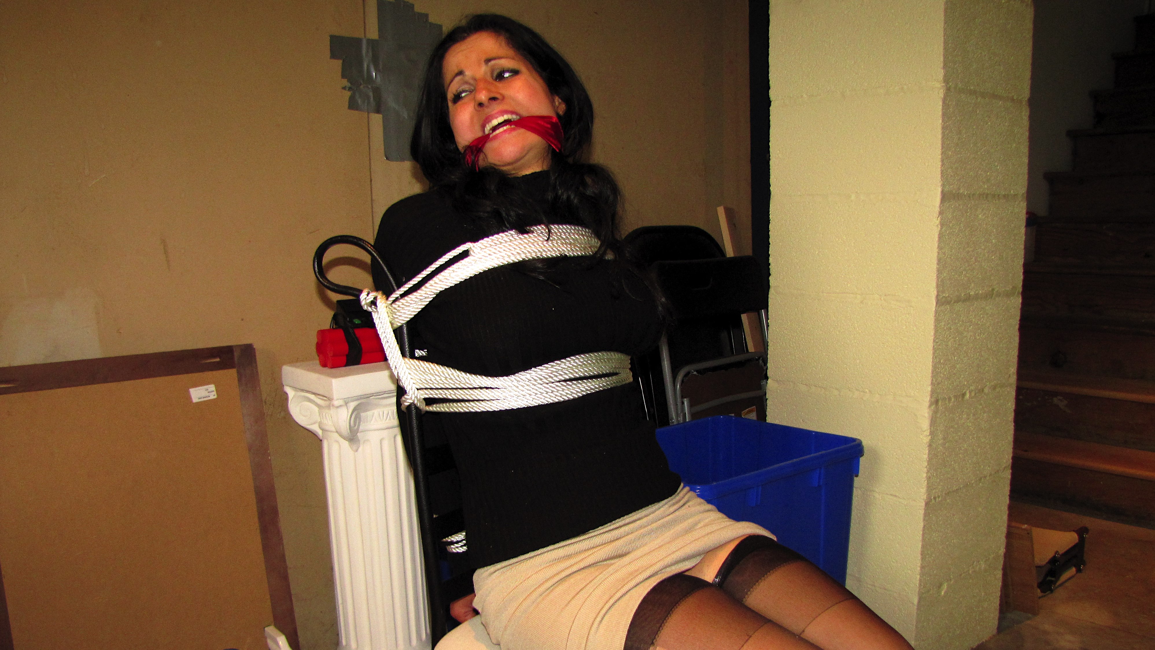 She is trapped. (All tying is done on screen).