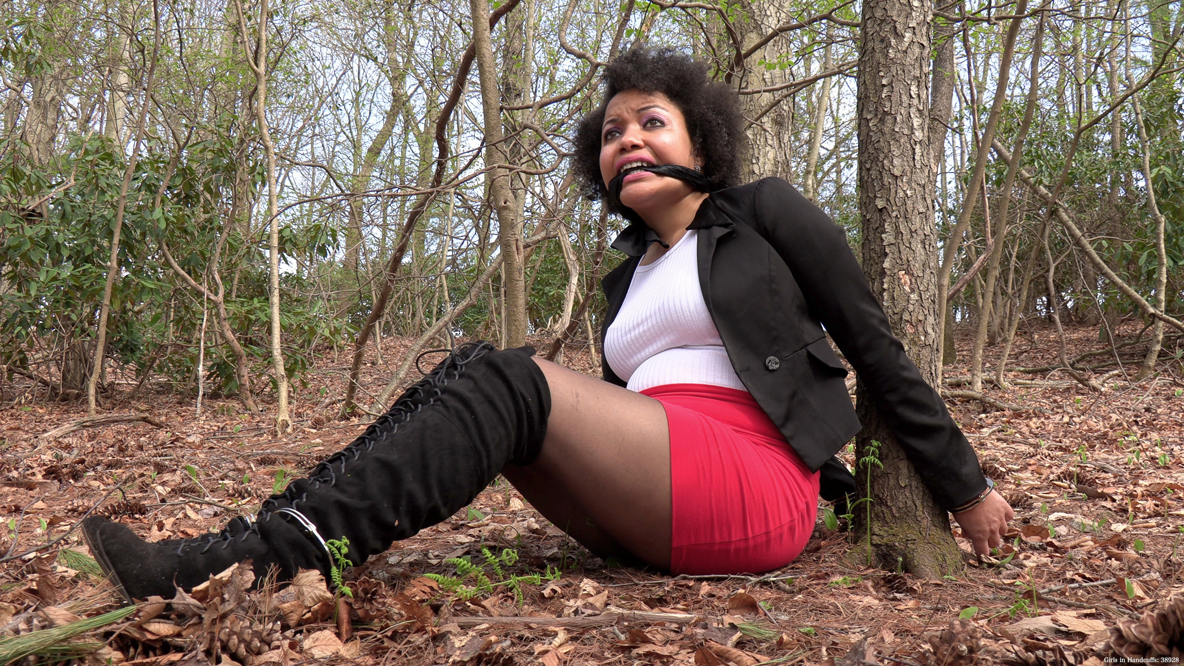 secures cuffs on her ankles connected by a chair to another nearby tree, seriously restricting her range of motion. Finally, Monica is gagged to ensure she does not shout for