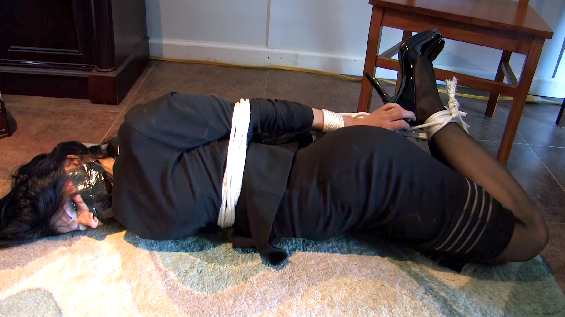 kneel down and then applies zipcuffs to her ankles. Hannah is now helpless and can do nothing to stop the man lowering her to the floor and stuffing a cloth into her mouth