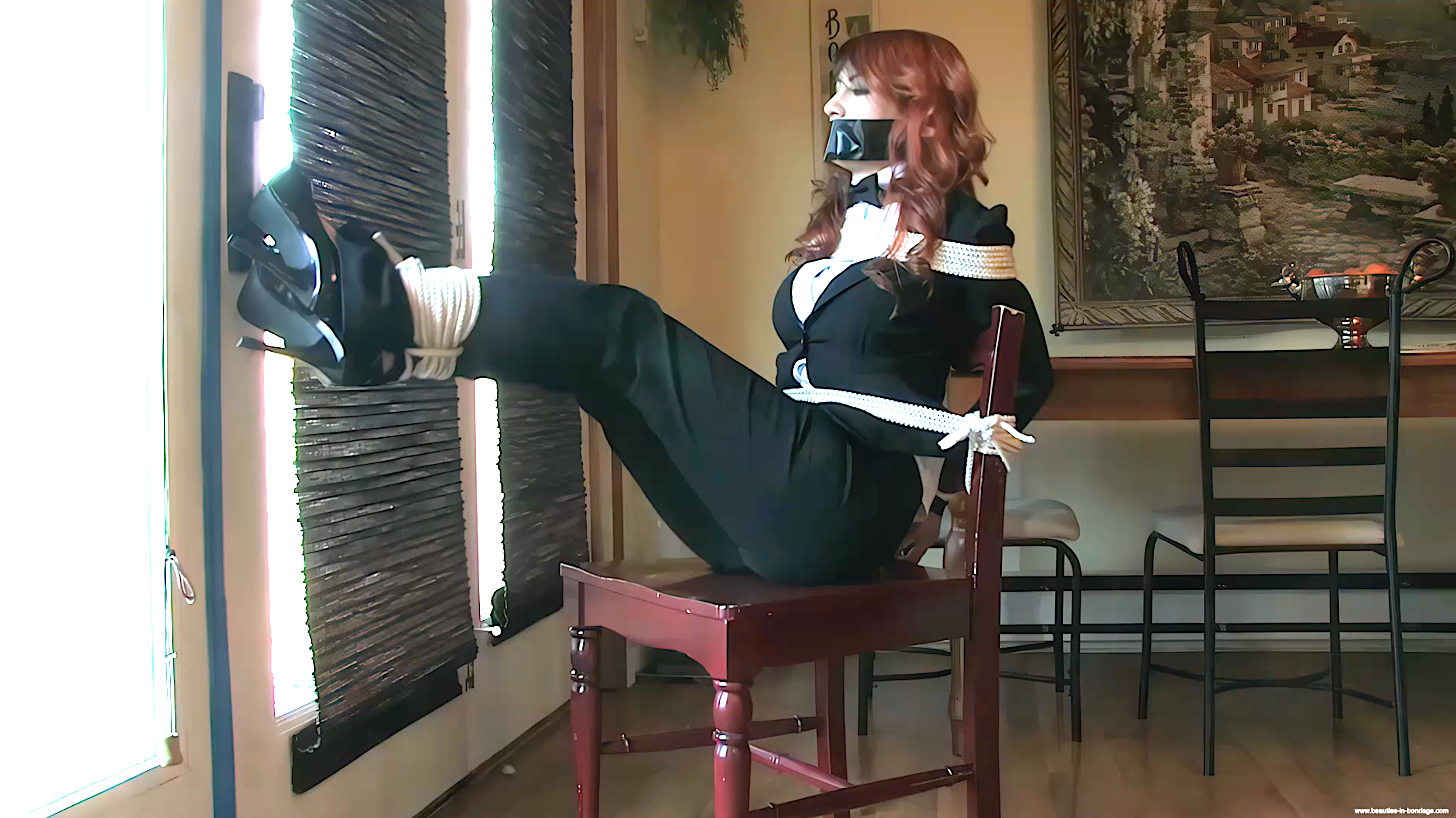 Scarlett has been captured upon arriving home from work and has been tied to a chair, with plenty of rope pinning her arms to her body, connected to her